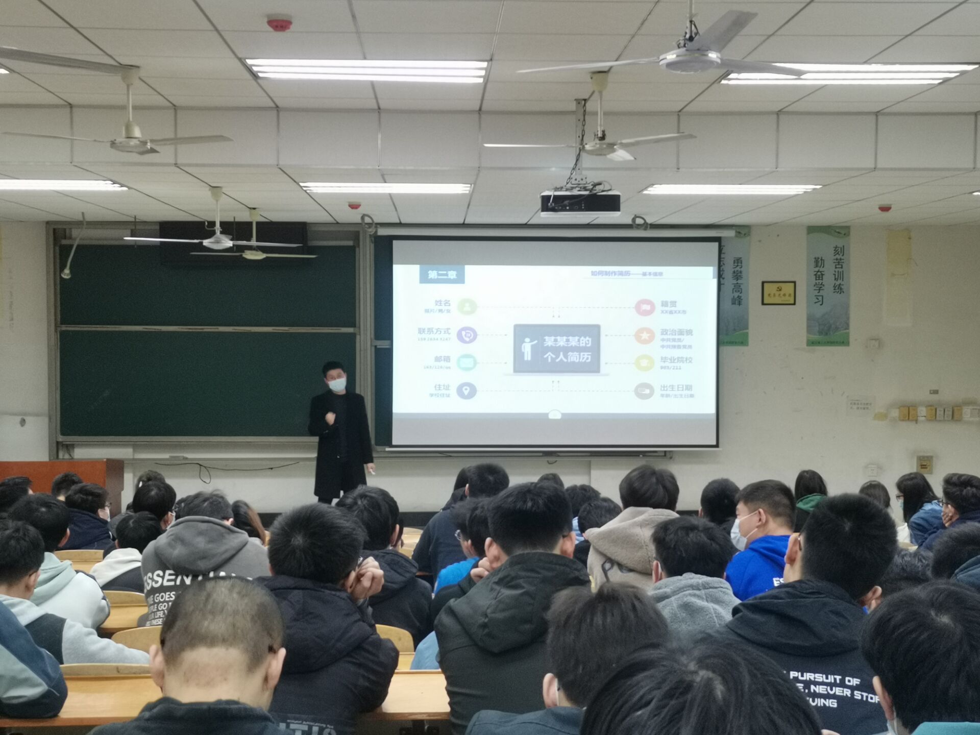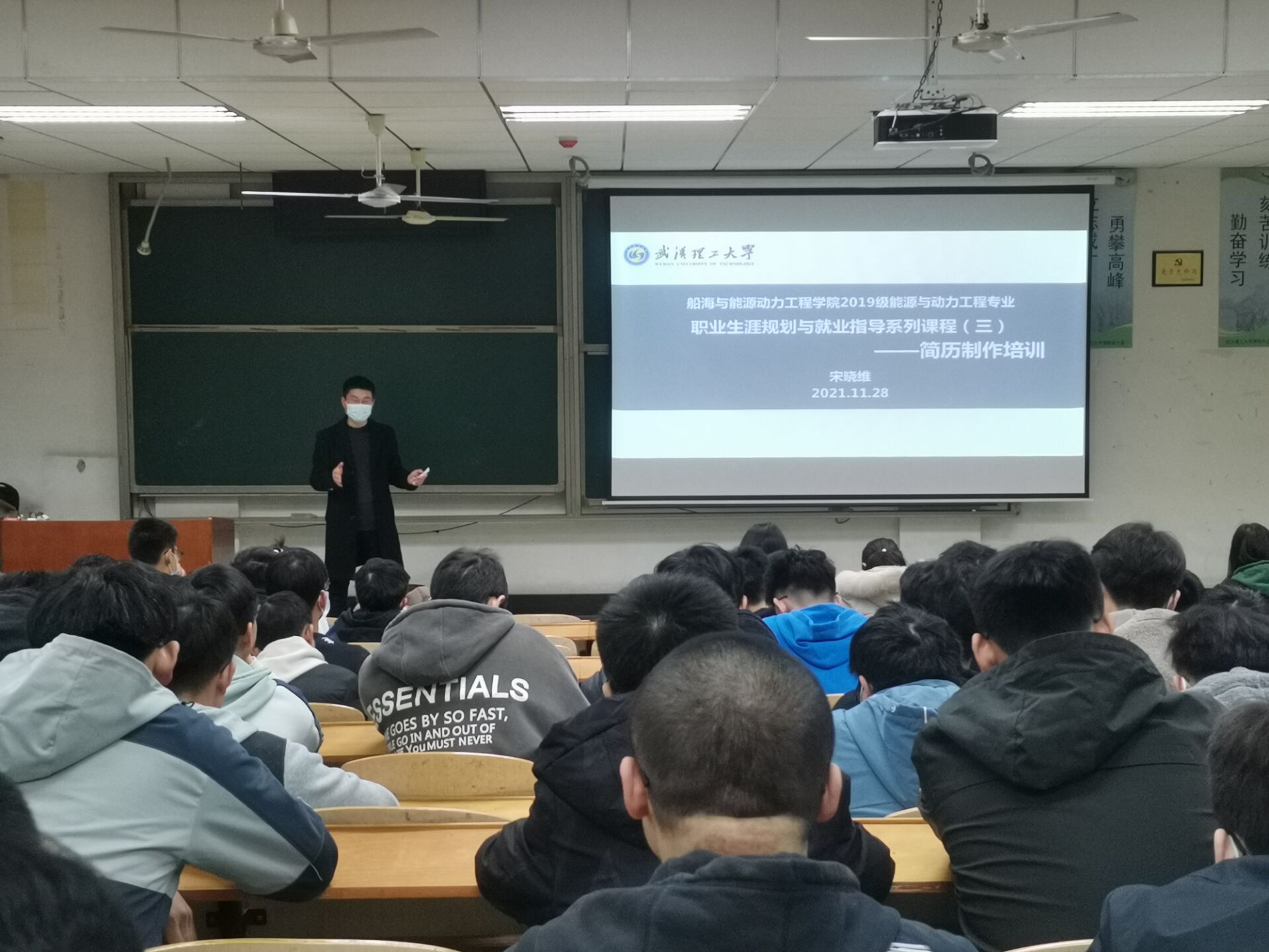 为进一步提高年级学生求职技巧,提升年级学生职业素养,11月27日晚和12月5日晚,成人影视片 2019级能源与动力工程专业利用年级周课主阵地,在航海楼315教室开展职业生涯规划与就业指导(第三讲)——学会制作简历。本次培训由辅导员宋晓维老师主讲,2019级能源与动力工程专业全体同学都参与了此次培训。